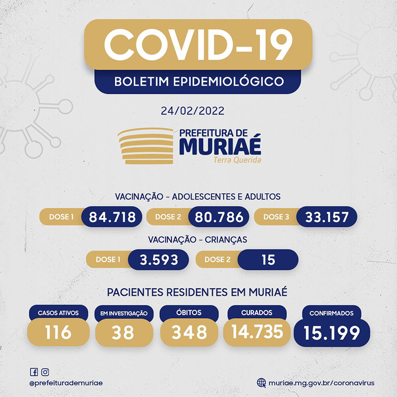 O boletim desta quinta-feira (24) mostrou que 11 novos casos de Covid foram registrados em Muriaé nas últimas 24 horas. O número de pacientes ativos teve nova redução: agora são 116 muriaeenses ainda em recuperação da doença.