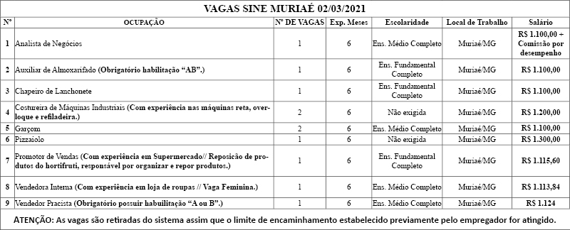 Confira as vagas de emprego divulgadas pelo SINE nesta terça-feira (02)