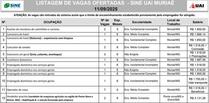 Confira as vagas de emprego ofertadas pelo SINE nesta quinta-feira (11)