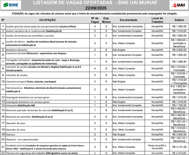 Confira as vagas de emprego ofertadas pelo SINE nesta segunda-feira (22)