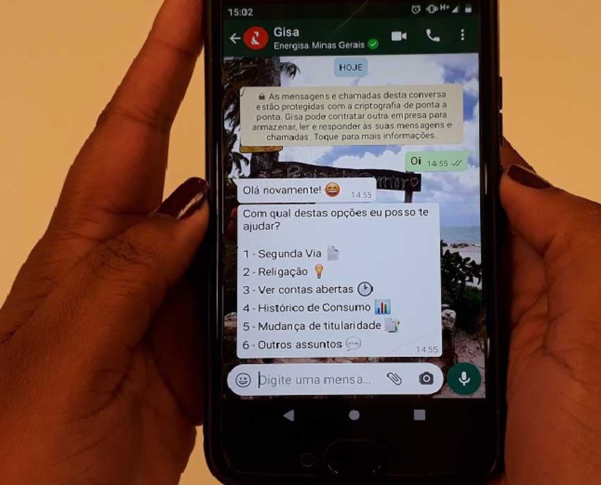 Para entrar em contato com a Gisa, é só adicionar o número 32 98426-1352 e mandar um ‘oi’. A assistente responderá rapidamente com algumas opções sobre o assunto que o cliente deseja tratar. Basta informar a opção de serviço desejada e enviar para prosseguir o atendimento. “Caso seja o seu primeiro contato com a Energisa através da Gisa, ela pedirá uma confirmação dos seus dados e em seguida vai listar alguns dos serviços oferecidos. É só responder com o número da opção desejada e pronto”, orienta Hermann Clay, coordenador de canais digitais da Energisa. Caso o que você queira não esteja listado, digite claramente o nome do serviço ou uma palavra chave que ela vai direcionar a conversa para o assunto. Simples e ágil.