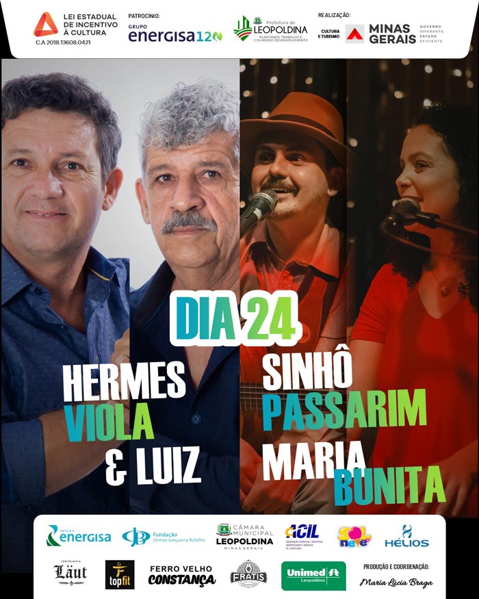 Na quinta-feira, (24), a programação segue valorizando os talentos locais, entre eles Hermes Viola e Luiz, e os vencedores do concurso de 2024, Sinhô Passarim e Flor Bunita, que voltam ao palco como convidados especiais.