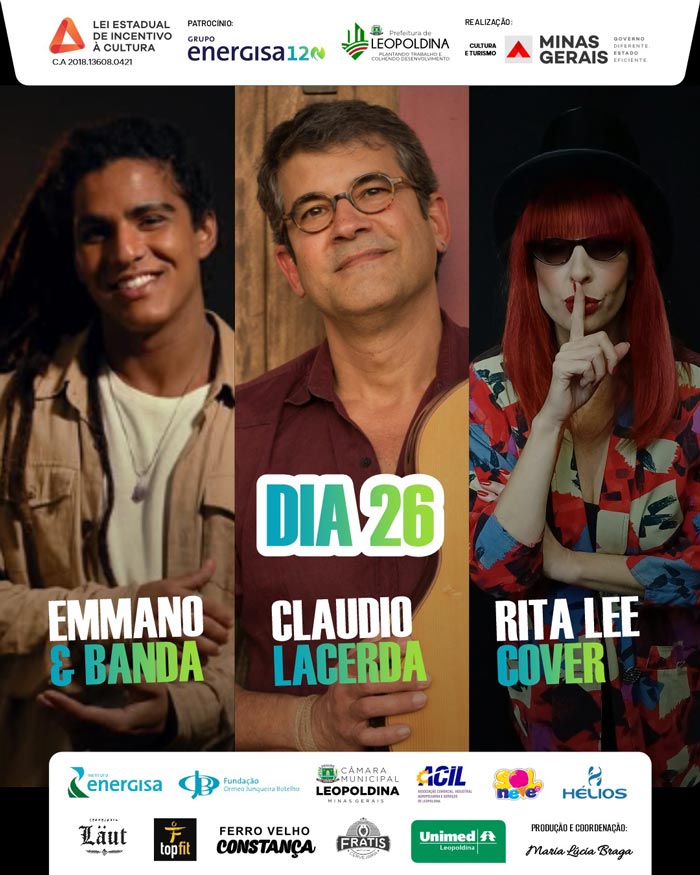 O sábado (26) será dedicado à mistura de sonoridades. Emmano & Banda, o violeiro Cláudio Lacerda e o tributo à eterna Rita Lee, interpretado pela aclamada cover Lia Santhiago, prometem encerrar a noite com energia e irreverência.