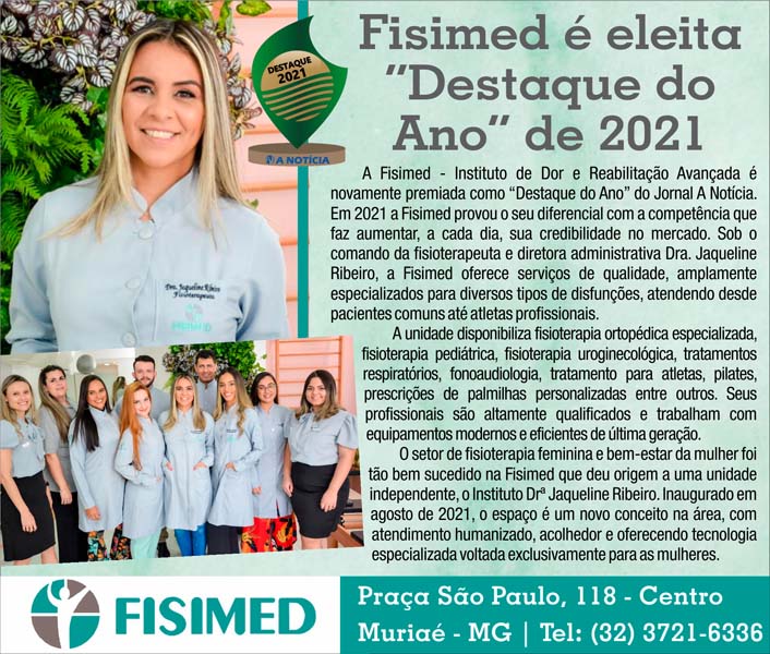 A Fisimed – Instituto de Dor e Reabilitação Avançada é novamente premiada como “Destaque do Ano” do Jornal A Notícia. Em 2021 a Fisimed provou o seu diferencial com a competência que faz aumentar, a cada dia, sua credibilidade no mercado. Sob o comando da fisioterapeuta e diretora administrativa Dra. Jaqueline Ribeiro, a Fisimed oferece serviços de qualidade, amplamente especializados para diversos tipos de disfunções, atendendo desde pacientes comuns até atletas profissionais.