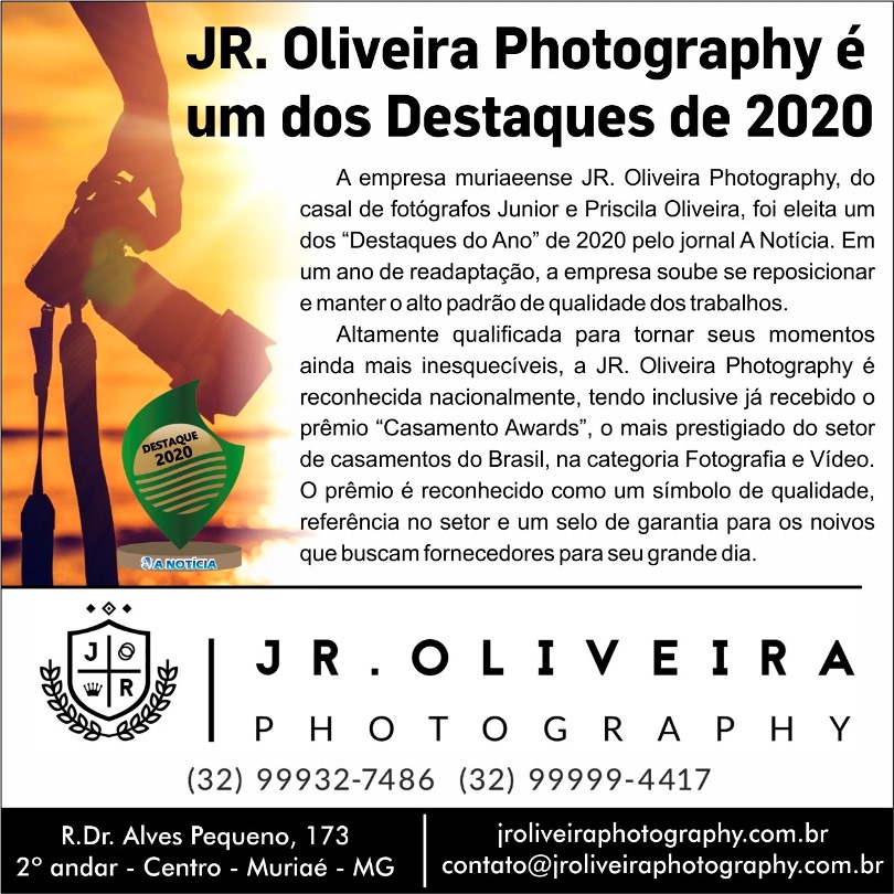 A empresa muriaeense JR. Oliveira Photography, do casal de fotógrafos Junior e Priscila Oliveira, foi eleita um dos “Destaques do Ano” de 2020 pelo jornal A Notícia. Em um ano de readaptação, a empresa soube se reposicionar e manter o alto padrão de qualidade dos trabalhos.