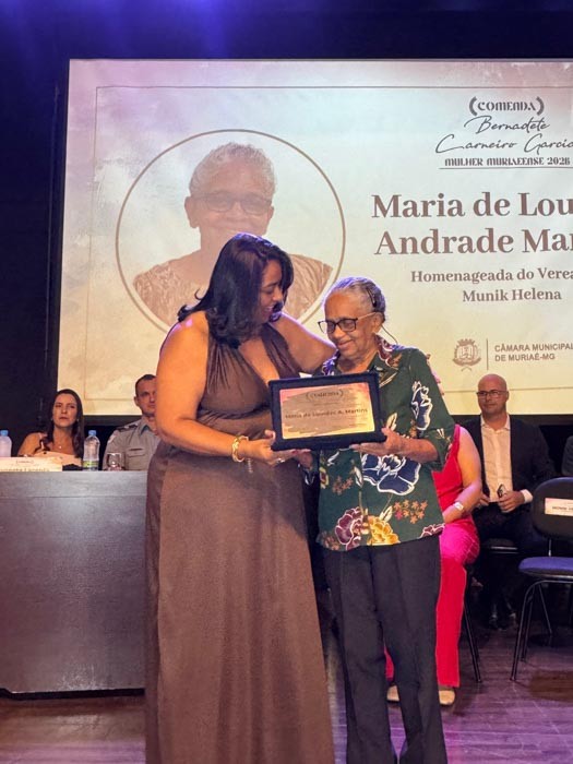 A Câmara de Muriaé homenageou Maria de Lourdes Andrade Martins durante a solenidade da Comenda Bernadete Carneiro Garcia – Mulher Muriaeense 2026, reconhecendo sua trajetória marcada pela generosidade, pelo compromisso com o próximo e pela atuação ativa na comunidade.