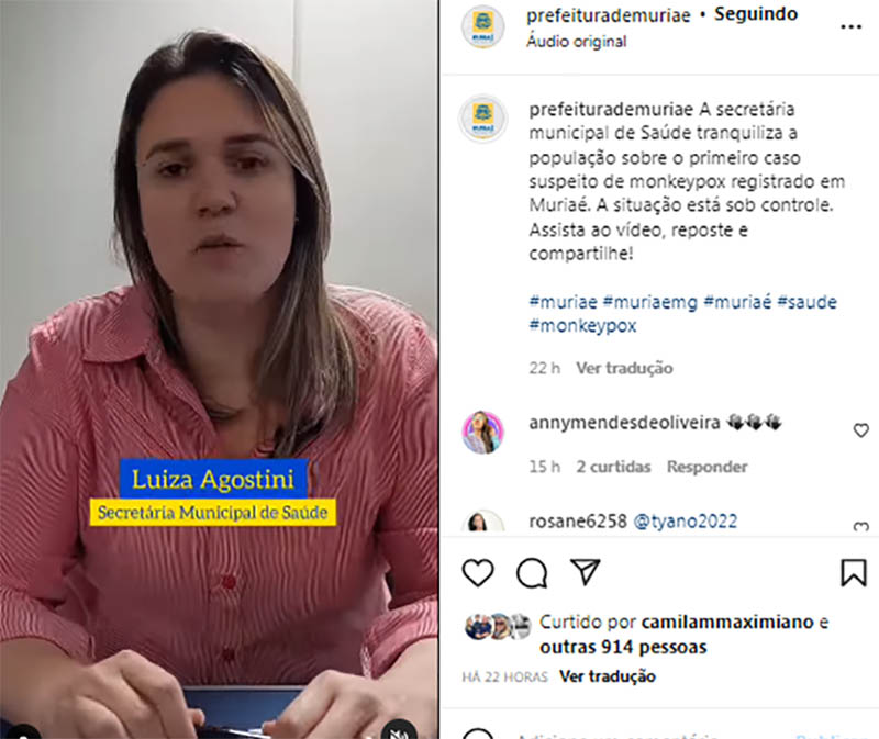 A secretária municipal de Saúde de Muriaé, Luiza Agostini, usou as redes sociais da Prefeitura, na noite de terça-feira (9), para publicar um vídeo, informando sobra a investigação de um caso suspeito de monkeypox registrado em Muriaé.