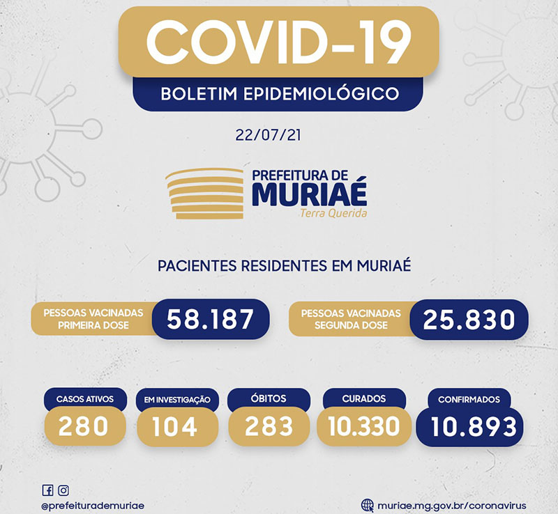 O boletim desta quinta-feira confirmou 37 novos casos de covid-19 em Muriaé. Nenhum óbito foi registrado em função da doença.