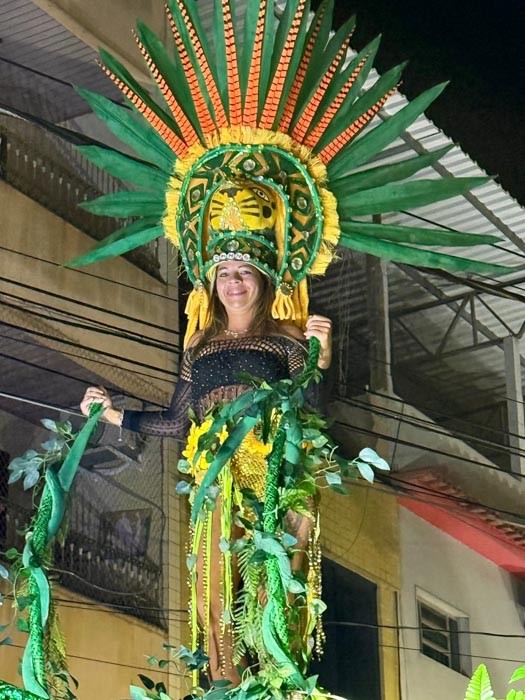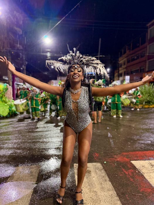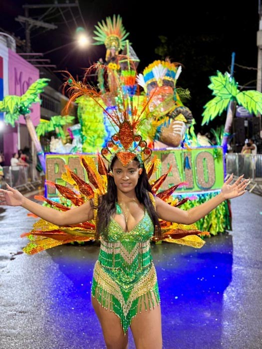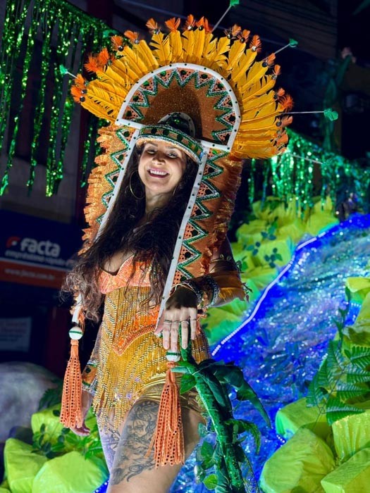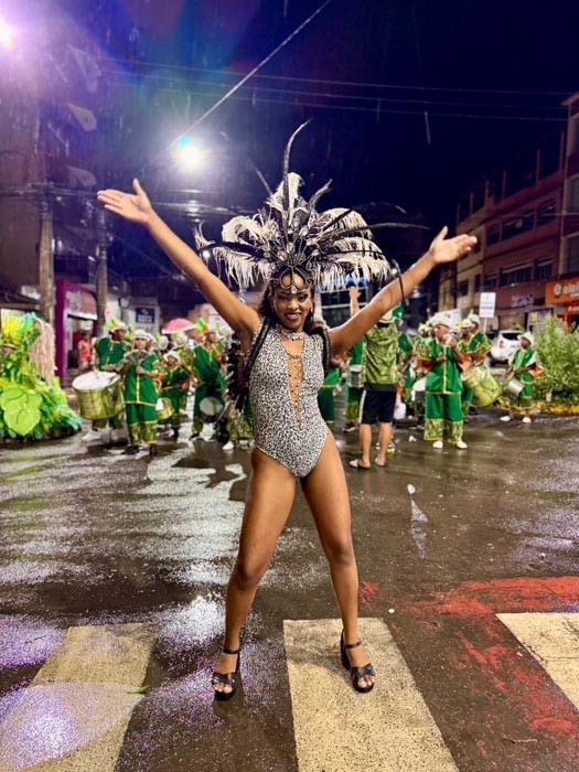 A presidente da escola, Thayná Gardoni, destacou a alegria e a emoção de concluir mais um desfile ao lado da comunidade, ressaltando que o trabalho foi construído de forma coletiva.