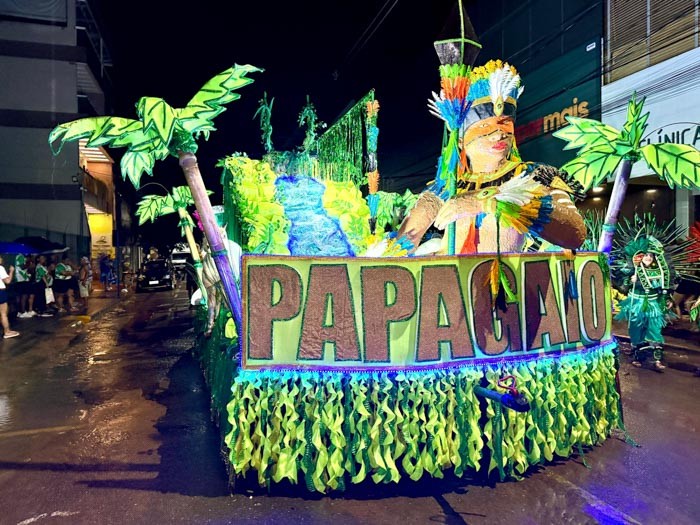 Com o enredo “No berço esplêndido da criação, Papagaio pinta a esperança com as cores da imaginação”, a escola levou para a praça uma apresentação que exaltou a origem da vida e a importância da preservação da natureza. A mensagem ambiental foi o fio condutor do desfile, reforçando a necessidade de cuidar da biodiversidade, dos rios, do clima e da água.
