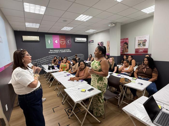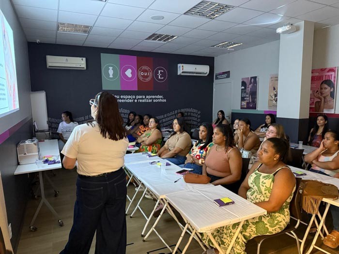 Representando o time de impacto social do Grupo Boticário, Carla Almeida explicou que o projeto foi criado em 2021, inicialmente na modalidade online, reunindo mais de 700 mil inscritas e mais de 140 mil mulheres formadas em todo o país. Desde 2025, a iniciativa passou a contar também com turmas presenciais em parceria com franqueados.