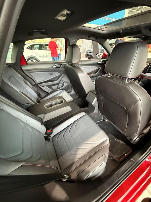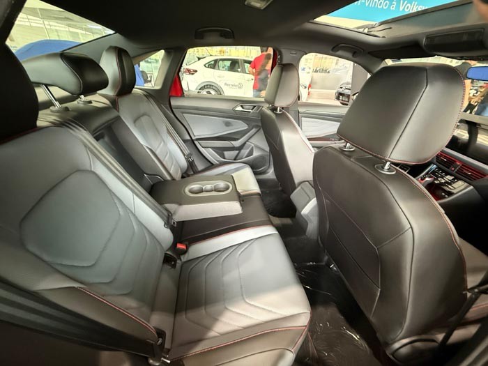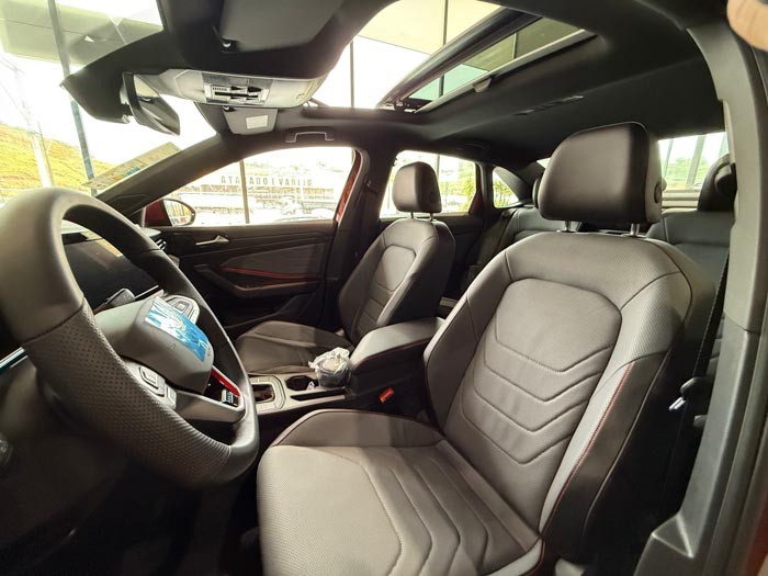 O interior reflete o conceito premium da Volkswagen, com acabamento refinado, bancos esportivos em couro com costuras vermelhas, painel digital configurável, sistema multimídia VW Play de 10 polegadas e iluminação ambiente personalizável. O modelo ainda conta com teto solar panorâmico, carregador de celular por indução e pacote completo de assistentes de segurança, como controle de cruzeiro adaptativo, detector de fadiga e frenagem autônoma de emergência.
