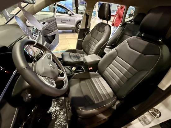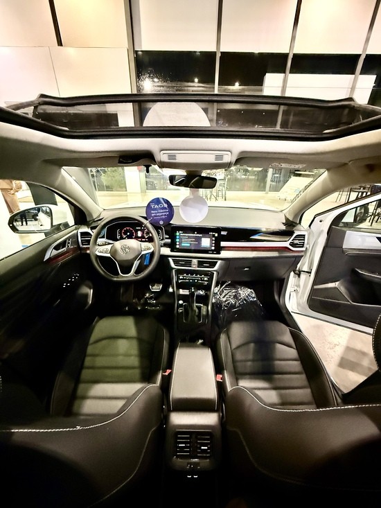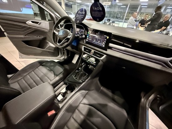 No interior, o Novo Taos oferece uma experiência elevada de conforto e tecnologia. O modelo conta com painel de instrumentos digital personalizável, central multimídia VW Play Connect de 10 polegadas, volante multifuncional, bancos de couro e ar-condicionado digital de duas zonas, proporcionando praticidade e bem-estar para motoristas e passageiros. O teto solar panorâmico amplia a sensação de espaço e conexão com o ambiente externo.