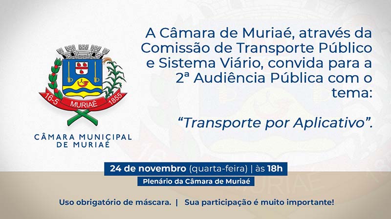 A Câmara de Muriaé realizará na próxima quarta-feira (24), audiência pública para discutir sobre transporte individual privado remunerado de passageiros, mais conhecido por transporte por aplicativo. Esta é a segunda audiência sobre o tema e a quinta realizada pela Casa em 2021. O evento acontece a partir das 18h, no plenário da sede do Poder Legislativo, Centro.