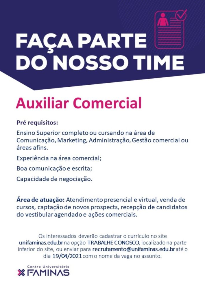 O Centro Universitário FAMINAS anunciou a abertura de duas vagas de emprego, para Auxiliar de Secretaria Acadêmica e Auxiliar Comercial.