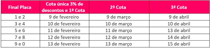 O cronograma tem início no dia 9 de fevereiro, quando vencem a cota única e a primeira parcela dos veículos com final de placa 1 e 2, seguindo o calendário oficial definido pelo Estado conforme a numeração final da placa.